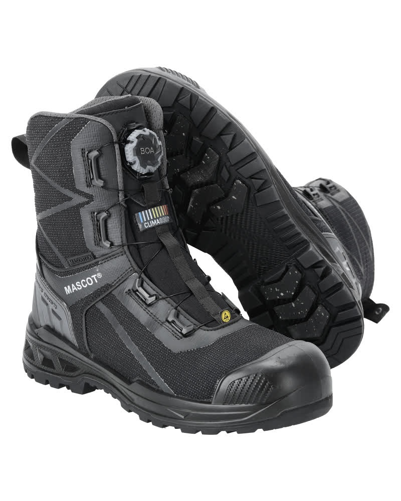 Sluit en opent met het Boa® Fit System door middel van een draaiknop, draad en geleiders. De aluminium veiligheidsneus is ergonomisch gevormd. Tussenzool van PU. Rubberen loopzool met rubberen inzetstukken. De inlegzolen zijn uitneembaar, antistatisch en slijtvast. Vocht wordt opgenomen en effectief weggevoerd. Overneus van TPU is vormgegoten. De zool is olie- en benzinebestendig. De zool is hittebestendig tot 300° C contactwarmte. Laddergrip. De inlegzool is stootabsorberend. Isolerende Thinsulate™ Insulation voering. Waterdicht membraan van MASCOTEX®. Waterafstotend en ademend buitenmateriaal. Geschikt voor knielend werk. Hielkap. ESD-goedgekeurd volgens EN IEC 61340-4-3: 2018, EN 61340-5-1: 2016.- Goede pasvorm met BOA® Fit System.